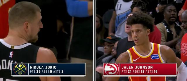 掘金23分逆转老鹰的这场比赛,杰伦-约翰逊半场11分10篮板12助攻,只用了一节多一点的时间就拿到了三双。在他的不断串联之下,老鹰全队半场就六人得分上双,这数据也算相当罕见了。